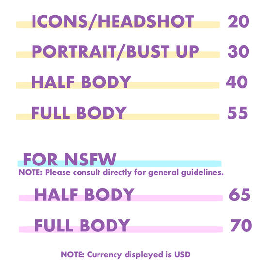 - Please write in a clear, descriptive manner.- Provide clean and visibly understandable references.- Any ill behaviour will not be tolerated, your commission will be canceled and no refunds will be provided.- Follow the rules provided in the commission info sheets and these terms stated. Failing to to do so may result to declining your commission as well as considering to deny future commissions.